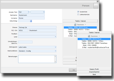 Ihr Kunde besitzt mehr als drei Telefonverbindungen? Kein Problem für unsere Adressverwaltung: Sie können beliebig viele Telefon- und Internetverbindungen eintragen und mit einer kurzen Anmerkung wie z.B. „Ferienhaus“ kennzeichnen. Firmen und Organisatoren können Sie Ansprechpartner zuordnen – auch in beliebiger Zahl. |