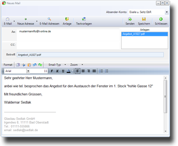 „Guten Tag, Firma Mustermann am Apparat. Ja, das Angebot geht noch in dieser Minute per E-Mail raus. " Jetzt ein einziger Klick und das Mail erscheint auf dem Bildschirm: die Angebotsnummer ist schon als Betreff eingetragen, ebenso die Mail- Adresse aus den Kundenstammdaten der Adressverwaltung, das Angebot im PDF- Format ist als Anlage beigefügt und der Textbereich hat bereits eine Grußformel und meine Firmensignatur. Noch ein paar Begleitworte und eine Bilddatei hinzufügen und ... abschicken! Kein Umschlag, kein Porto, keine Wartezeit. |